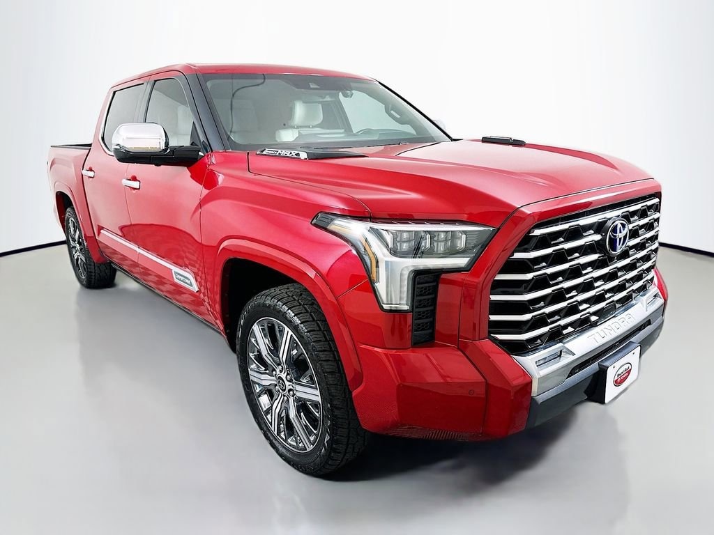 Tundra Hybrid Capstone, 4D Crew Cab, 3.4L V6, 10-Speed Automatic, 4WD, Supersonic Red, Black/White w/Semi-Aniline Leather Seat Trim, 3.31 Axle Ratio, AM/FM radio: SiriusXM, Apple CarPlay/Android Auto, Auto High-beam Headlights, Auto-dimming Rear-View mirror, Automatic temperature control, Delay-off headlights, Front dual zone A/C, Front fog lights, Fully automatic headlights, Heated & Ventilated Front Bucket Seats, Memory seat, Power driver seat, Power moonroof, Semi-Aniline Leather Seat Trim, Wheels: 22 Dark Chrome Alloy.